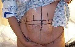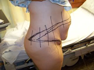 The day of the surgery I was so excited and nervous. I didn't have to have to be at the hospital until 10 so time to get the kids off to school before heading to Louisville. The Surgery will be done at Jewish Hospital in the Trager Pavilion http://www.jewishhospital.org/healthnetwork/trager_tour4.html . This isn't part of the regular hospital. It is a very nice separate bldg across the street. When you walk in the lobby on the 14th floor where they do the plastic surgery it is huge walls of glass overlooking the city with palm trees and plush chairs. We were quite early since we were worried about traffic. We couldn't stop for food since I couldn't eat so we just went and waited in the lobby. Once they took us back to prep me everyone so nice. It was a long wait because my surgery wasn't actually scheduled until 12 and he had another procedure that ran over. But the nurses were very nice, we had a TV in our prep area, they brought me heated blankets. But the most comforting thing was seeing how they talked about Dr. Wilhelmi. You know how some people will tell you, "oh he is good" but you can tell they are just saying it because they feel they have to? But every nurse would tell me how I have the best Dr. and how good he was and it was on their face and in their voice that they meant it. You could just tell they enjoyed working with him. You could just see it in his office staff and now the hospital staff. Really made me more comfortable. One nurse said she wished she could go to him, meaning she wished she had the money to go to him. So Doc. comes in to mark me for surgery. It was hard to stand still and not laugh as we cracked jokes about the state of my stomach. He had his resident and was explaining why he was marking what where. I wasn't making it easy making comments like he could just get a paper cutter and pull it all forward and chop it off. Or referring to my stomach as the elephants ass. So above are the pics from being marked up. As you will see I have NO shame. He removed everything from the top line arch and around to the sides down to the line at the pubic line that you can't really see because of all the extra skin that hangs down and covers it. The line down the middle in the front view is the midline. Where the middle of my stomach should be. You can see what is left of a belly button is way off midline. The bulge on each side of that line that just sticks out and has all the skin hanging from it like that thing below a turkey's neck are my stomach muscles. That is my diastasis recti. My stomach muscles had a horrible divorce 9 years ago. There is nothing between them. I can just lay my hand on my stomach and feel gas and stuff going through my intestines. Very gross but kinda cool sometimes. Then the panniculus (extra skin that just hangs down over over my pubic area). Actually have a double panniculus in the middle where on overlaps the other. But I was trying to cover my goodies so I didn't offend and covered it also by mistake and can't go back and retake.
